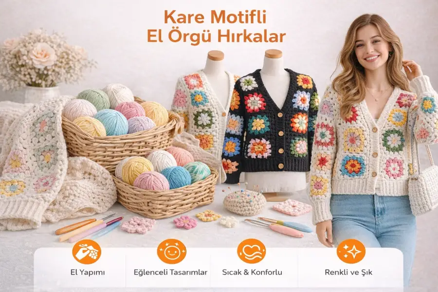 El Örgüsü Kare Motif Hırkalar, Hediyelik Çoraplar, Berele,Atkılar vb.