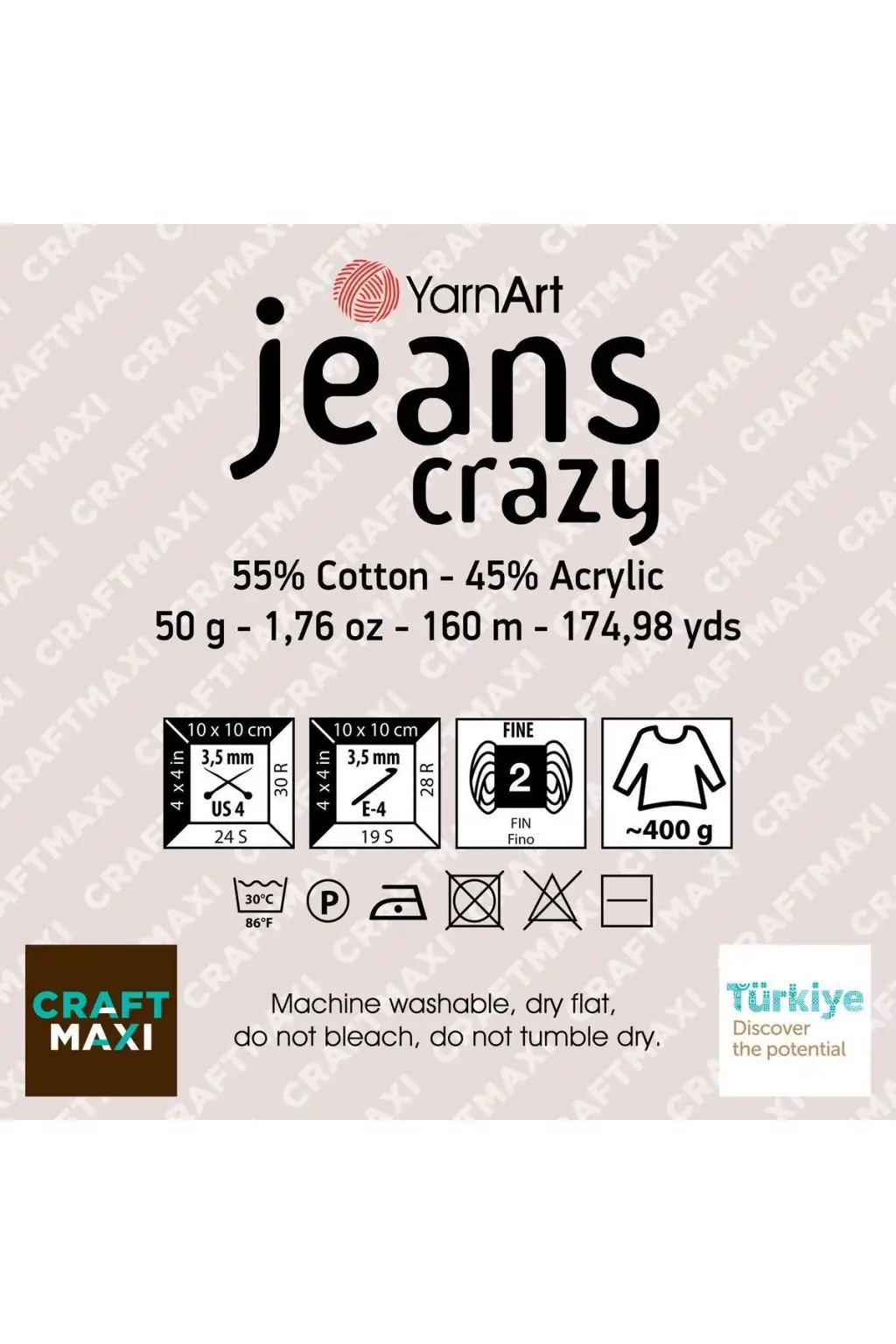 Ebruli ipler yapısı gereği farklı renkler karıştırılarak üretildiği için yumakların renk kodu ve lot numaraları aynı olsa dahi, renk geçişleri ve tonları farklılık gösterebilir; Tek siparişte projenize yetecek sayıda ürün almanızı öneririz; Yarnart Jeans Crazy, tüm Jeans serileri gibi pamuk ve poliakrilik içeriğe sahiptir; Jeans Crazy, geçişli renk tonlarıyla yazlık ve mevsimlik örgüler için alternatif oluştururken ev tekstili ve amigurumi oyuncak yapımında da tercih edebilirsiniz; Örmesi oldukça kolay, yumuşak bir ip olan Jeans Crazy ile örülen giysiler ve aksesuarlar esneme yapmaz, tüylenmeye karşı dayanıklıdır; İçerik: %55 Pamuk; %45 Poliakrilik Ağırlık: 50 g Uzunluk: 160 m Şiş numarası: 3,5 mm Tığ numarası: 3,5 mm Kalınlık grubu: İnce 1 adet fiyatıdır;
