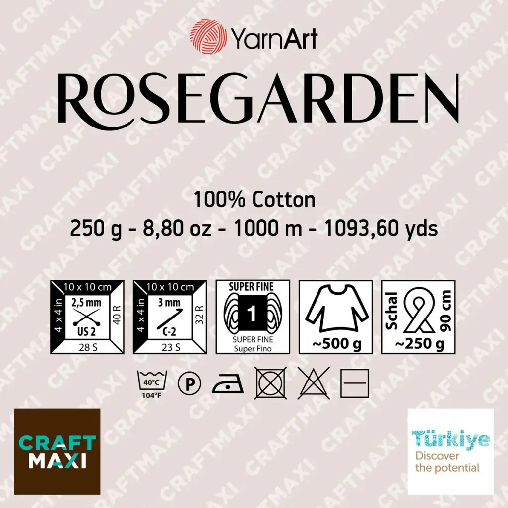 Ebruli ipler yapısı gereği farklı renkler karıştırılarak üretildiği için yumakların renk kodu ve lot numaraları aynı olsa dahi, renk geçişleri ve tonları farklılık gösterebilir. ; Tek siparişte projenize yetecek sayıda ürün almanızı öneririz. ; Yarnart'ın yepyeni serisi Rosegarden %100 pamuk içeriği ve birbiriyle uyumlu renk geçişleriyle yazlık örgülerinizin vazgeçilmezi olacak. ; Yumuşak dokusu sayesinde bluz, elbise, şal, etek gibi tüm kıyafet ve aksesuar örgülerinizde tercih edebileceğiniz Rosegarden serisini doğal içeriği nedeniyle bebek ürünlerinde de güvenle kullanabilirsiniz. ; 1000 metrelik kek ip şeklinde sunulan Rosegarden, pürüzsüz yapısı sayesinde hem şiş hem de tığ ile rahatlıkla örülebilir. ; İçerik: %100 Pamuk Ağırlık: 250 g Uzunluk: 1000 m Şiş numarası: 2,5 mm Tığ numarası: 3 mm Kalınlık grubu: Çok ince 1 adet fiyatıdır.;