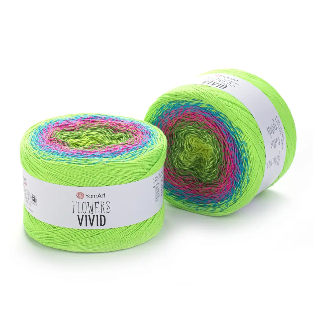 Yumuşak geçişlerle bir araya gelen fosforlu renklerden oluşan YarnArt Flowers Vivid, pamuk – akrilik karışımlı içeriği, birbirinden canlı renkleriyle yazlık örgülerinizde istediğiniz sonuçları elde etmenizi sağlar. 1000 metre uzunluğunda yumaklardan oluşan serinin tek bir yumağıyla orta büyüklükte bir ürün örebilirsiniz. Özellikle şal, battaniye, elbise, bluz, hırka, bebek ürünleri ve ev aksesuarları gibi örgülerde tercih edebileceğiniz YarnArt Flowers Vivid, hem tığ hem de şiş ile örülebilir.